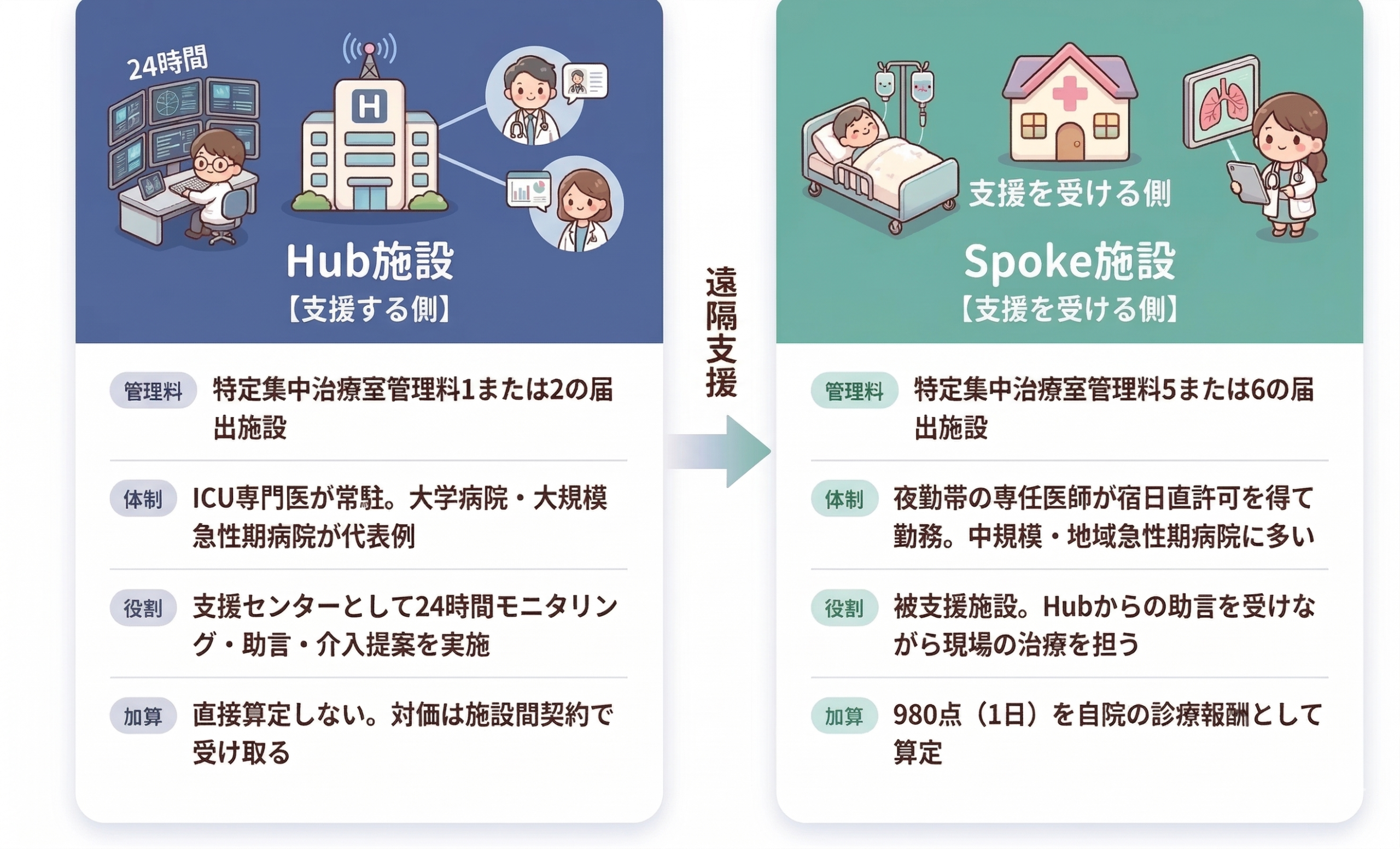 遠隔ICUには2種類の施設があります。「支援を提供する側」のHub施設と、「支援を受ける側」のSpoke施設です。自施設がどちらに該当するかは、現在の特定集中治療室管理料の届出区分を確認すればわかります。