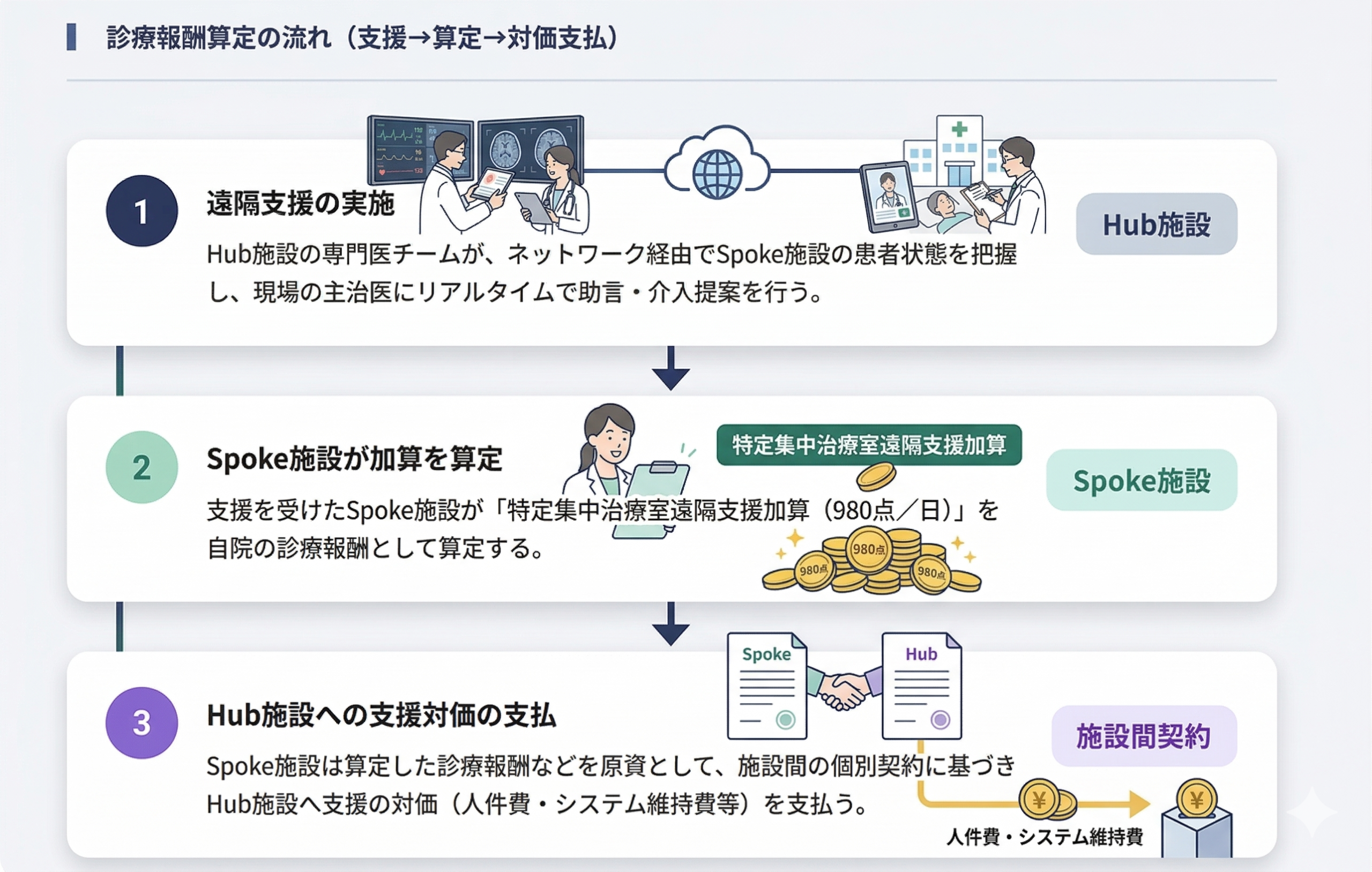 遠隔ICUによる支援は、Spoke施設の患者に対して提供されます。その「支援を受けた質の高い集中治療体制」の評価として、Spoke施設が自院の診療報酬として「特定集中治療室遠隔支援加算(980点)」を算定する仕組みになっています。Hub施設はこの加算を直接算定するわけではなく、対価は次のセクションで説明する「施設間契約」を通じて支払われます。